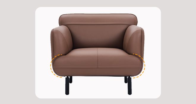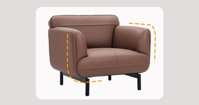 O contorno externo é tratado com cantos arredondados grandes e o lado externo do apoio de braço é tratado com bordas chanfradas.